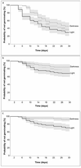 Kaplan–Meier survival curves of Frangula alnus seeds germinated in light and dark conditions at (a) 20 °C; (b) 24 °C; and (c) 28 °C (95% confidence intervals).