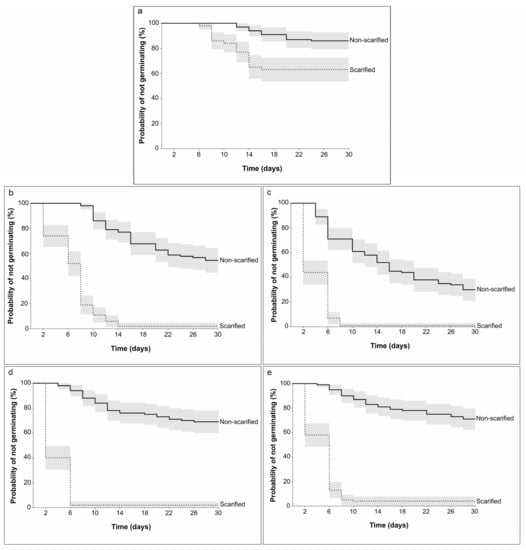 Kaplan–Meier survival curves of Frangula alnus seeds that were scarified and non-scarified at different temperatures: (a) 12 °C, (b) 16 °C, (c) 20 °C, (d) 24 °C, and (e) 28 °C; 95% confidence intervals.