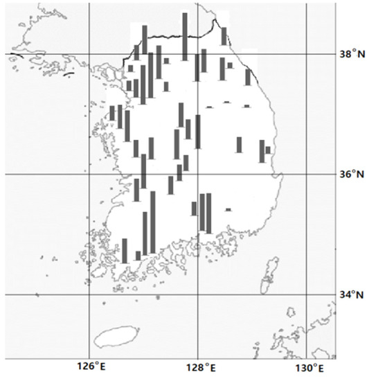 Climatic data of the past 10-year average from the 37 closest stations were extracted from the Open Met Data Portal in the National Climate Data Center (https://data.kma.go.kr/stcs/grnd/grndTaList.do?pgmNo=70, accessed on 3 June 2022). The highest and annual mean temperature of each stand was measured on July–August (the highest) and calculated by subtracting 0.65 °C for each 100 m difference in the altitude of the weather station nearby from that of the stand. In winter, the lowest temperature in January–February was calculated by subtracting 0.98 °C for each 100 m increase in altitude followed by the meteorology3 (http://www.meteo.psu.edu/wjs1/Meteo3/Html/stability.htm, accessed on 20 June 2023). Humidity was calculated to decrease by 4% for each 1 km increase in altitude [11].