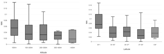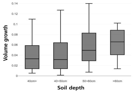 For altitude, the data encompassed 33 plots between 40 and 100 m, 49 plots between 201 m and 300 m, 17 plots from 301 to 400 m, and six plots above 400 m (Figure 2). Volume growth decreased with increasing altitude. Plots below 100 m showed the best growth, while plots above 400 m showed the poorest growth. A slight negative association was found between altitude and volume growth (r = −0.24, p < 0.097). Overall, the results indicate that yellow poplar growth in Korea declines with increasing latitude, longitude, and altitude.