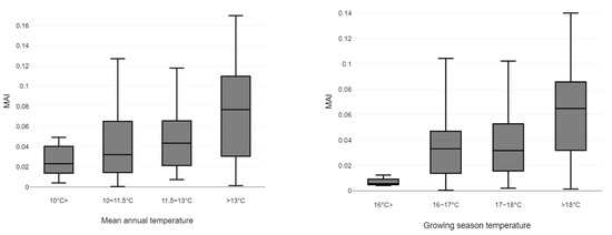Figure 1 shows the mean annual volume growth of yellow poplar in the stands. The volume growth varied widely, from 0.0004 to 0.1175 m3, with an average of 0.0437 m3. Despite the similarity in climate, the volume growth varied between regions. The most favorable stands were located in the southernmost region, which has higher temperatures and precipitation. Interestingly, some stands in the northern region also exhibited robust growth, despite cooler temperatures than the native habitat. Conversely, weaker growth was generally observed in the eastern half of the country, even though favorable environmental factors were expected. There were a few exceptions, such as stands with lower precipitation levels.