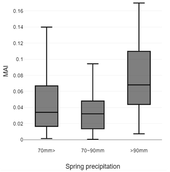 Four precipitation variables were analyzed: annual precipitation (AP), growing season precipitation (GP), winter precipitation (WP), and spring precipitation (SP). AP ranged from 1011 to 1518 mm, with an average of 1256 mm. GP ranged from 911 to 1374 mm, with an average of 1114 mm. WP ranged from 85 to 224 mm, with an average of 142 mm, and SP ranged from 60 to 129 mm, with an average of 78 mm per month. Spearman’s rank correlation between volume growth and AP, GP, and WP was weak. SP showed no significant correlation with volume growth (Table 4). However, volume growth was notably higher for precipitation levels over 90 mm (Figure 4).