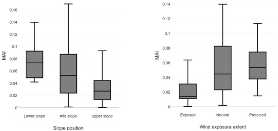Wind exposure (WE), categorized as exposed, neutral (partially exposed), and protected based on facing hills that affected wind flow, showed a moderate negative correlation with volume growth (r = −0.53, p < 0.001, Table 6). Volume growth was significantly lower in exposed wind conditions than in neutral or protected conditions (Figure 5). The effects of WE appeared to be similar to those of altitude, with stands at higher altitudes and those that were more exposed to wind having lower volume growth.