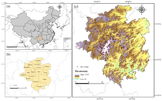 The location and elevation of Qiandongnan Prefecture. (a) Location of Qiandongnan Prefecture in China; (b) Counties in Qiandongnan Prefecture; (c) The distribution of Miao villages in Qiandongnan Prefecture.