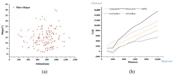 Distribution of Miao villages in elevation and slope: (a) average elevation and slope of Miao village; (b) spatial distribution patterns of Miao villages at different distances.