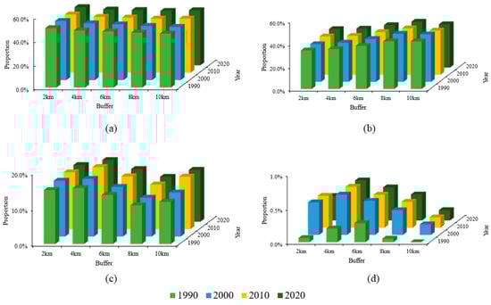 Over time, the proportion of closed-canopy forests decreased slightly in all buffer zones except the 8–10 km buffer zone from 1990 to 2020, and the change was not significant. Open-canopy forests, on the other hand, declined within all buffers, with the largest proportion in 1990. Shrubbery and other forests showed an increasing trend, reaching a maximum in 2020. Overall, the forest landscape around the Miao village had relatively little change in time and obvious spatial heterogeneity, which suggests that the distribution of the forest landscape may be affected by the Miao villages.