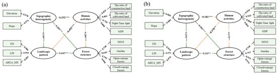 In this study, a structural equation modeling (PLS-SEM) approach was used to quantify the direct and indirect effects of topography, human activities, and landscape patterns on the forest structure around Miao villages. Compared with traditional statistical analysis methods, PLS-SEM is scientifically and credibly tested for reliability, validity and fit. The PLS-SEM model has the advantage of conducting exploratory research in the face of numerous influencing factors and influence paths, and it can analyze the causal relationships among multiple variables in the system simultaneously, facilitating model prediction. The model can also study the correlations of each path, and the user can specify various relationships and obtain valid information by testing them.