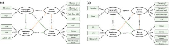 In addition, we can also find indirect effects of topographic factors on human activities in Miao villages, and the landscape pattern is directly affected by human activities in Miao villages, thus affecting the forest structure. The indirect effect of topography was particularly significant in 1990; it then decreased in 2000–2010 and increased again in 2020. There was little difference between the direct and indirect effects of altitude and topography. The direct effect of the landscape pattern was more significant in 1990 and 2010, and, among the three variables, the edge density had the greatest effect on the forest.