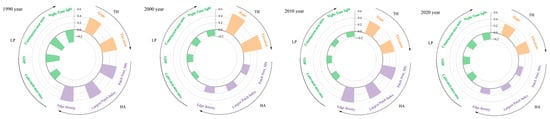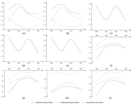 In multivariate analysis, the degree of influence of the independent variable on the dependent variable, i.e., the effect value, can be categorized into direct and indirect effects. The direct effect refers to the direct effect of the independent variable on the dependent variable, while the indirect effect refers to the indirect effect of the independent variable on the dependent variable, which is usually realized through the mediating variable. Based on the results of the PLS-SEM model, the direct and indirect effects of Miao villages on the surrounding forests were analyzed. As can be seen from Figure 5, human activities in Miao villages have significant direct and indirect impacts on the surrounding forests, and the direct impacts are significantly greater than the indirect impacts from 1990 to 2020. Among them, except in 2010, the proportion of construction land has the most significant negative impact on human activities in Miao villages, followed by GDP, night light, and the cultivated land proportion. In 2010, the proportion of arable land had the most significant negative impact, followed by night light, GDP, and the proportion of construction land. As for the direct and indirect effects, as for the total effects, except for 2010, the negative impact of construction land was the most significant. In 2020, the indirect impact of human activities was significantly reduced, and the direct impact was significantly increased.