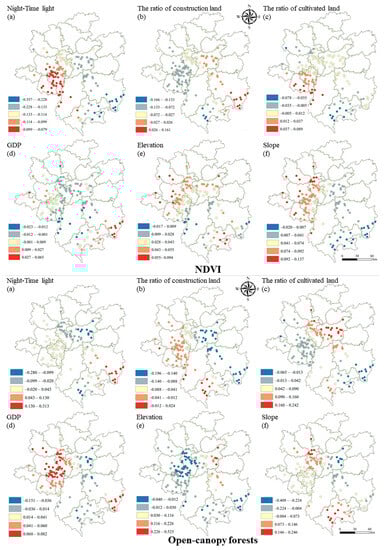 For the open-canopy forests, the regression coefficient of night light was −0.280–0.313, mainly in Taijiang County and Jianhe County. The regression coefficient of the proportion of construction land was −0.196–0.161, and the overall negative effect was relatively large in Jianhe County and Liping County. The regression coefficient of the cultivated land ratio was −0.065–0.242, and it had a positive effect mainly in Jianhe County and Taijiang County. The regression coefficient of GDP was −0.151–0.082, and it was mainly positive in Danzhai County, Leishan County, Taijiang County, and Kaili City. The regression coefficient of altitude was −0.040–0.525, and it had mainly a positive correlation, while the regression coefficient of slope was −0.409–0.246, and it was mainly positive in Congjiang County.