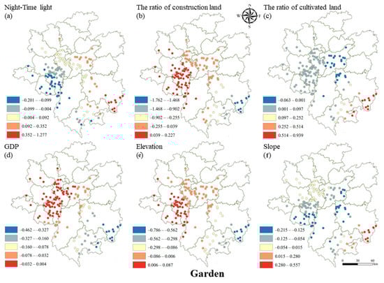 Spatial distributions of the corresponding coefficients for the observed variables based on the GWR model. (a) Night-Time light; (b) The ratio of construction land; (c) The ratio of cultivated land; (d) GDP; (e) Elevation; (f) Slope.