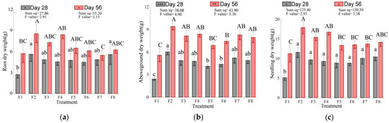 Biomass is an important parameter for measuring the organic matter content of seedlings. There were significant differences in the biomass of seedlings’ organs under different soaking root fertilizer treatments (Figure 5). At the third measurement, F2 and F8 had the highest RDWs (Figure 5a), which were 105.34% (5.61 g) and 104.03% (5.57 g) higher than F1, respectively. The ADW (Figure 5b) of F2 was also the highest, which was 147.46% (6.04 g) higher than F1. The application of soaking root fertilizer significantly increased the dry weight of seedlings, but there were no significant differences in the dry weight of seedlings under the different soaking root fertilizer treatments (Figure 5c). The highest R/S (Figure 5d) and SI (Figure 5e) were recorded for F8, but the differences among treatments were not significant. At the fifth measurement, the RDW, ADW, and SDW were the highest for F2, and were 49.63% (8.52 g), 68.28% (9.42 g) and 58.88% (17.95 g) higher than F1, respectively, with F4 having the next highest values. The highest R/S and SI were recorded for F4. A comparison between the two measurements showed that F4 was the only treatment in which the R/S increased, and F8 was the only treatment in which the SI decreased. The F1 dry weight index was the lowest in both measurements. In conclusion, F2 was the treatment most conducive to seedling material accumulation, F8 had a strong effect within 28 days, and F4 had an excellent performance after 28 days.