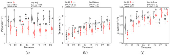The different soaking root fertilizer treatments had significant effects on the photosynthesis of E. urograndis seedlings. At the third measurement, there were no significant differences in the Pn among all the treatments (Figure 6a). The highest Tr (Figure 6b) was recorded for F8, which was 89.30% (3.54 mmol m−2·s−1) higher than F1. F1 had the lowest Tr. The Ci (Figure 6c) and Gs (Figure 6d) of F4 were the highest, and were 8.76% (345.99 μmol m−2·s−1) and 57.14% (0.44mmol m−2·s−1) higher than F1, respectively. The Ci and Gs of F1 were the lowest. The F1 had the highest WUE (Figure 6e), followed by F2, while F7 and F8 had the lowest. The F1 also had the highest Ls (Figure 6f), followed by F7 and F2, and F4, F5, F6 and F8 had the lowest WUE. At the fifth measurement, the Pn was the highest for F4, and was 0.17% (10.90 μmol m−2·s−1) higher than F1, followed by F1 and F8. Both F5 and F2 had the lowest Pn. The highest Tr (2.90 mmol m−2·s−1) was recorded for F8, which was 48.24% higher than F1, and F1 had the lowest Tr. F8 had a 16.94% (351.73 μmol m−2·s−1) higher Ci than F1, and F1 had the lowest Ci. F8 had the highest Gs (0.59 mmol m−2·s−1), which was 200.70% higher than F1, followed by F7. Both F1 and F2 had the lowest Gs. The WUE of F1 was the highest, followed by F2 and F3, with F8 being the lowest. F1 had the highest Ls, followed by F2, F7 and F8. In conclusion, the photosynthetic capacities of F8 and F4 were the strongest, while those of F2 and F1 were the weakest.