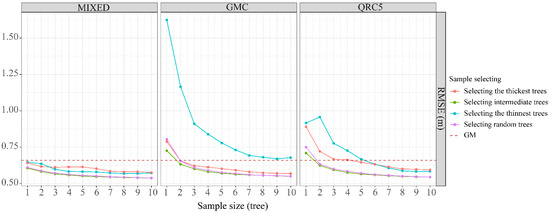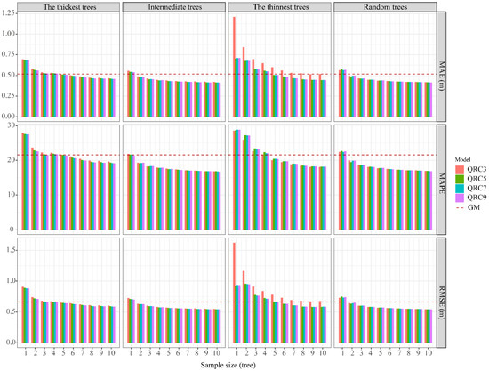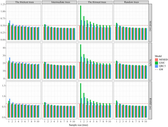- Randomly selecting 1 to 10 sample trees from each plot for calibration, repeating the process 50 times, and calculating the average to reduce the extreme calibration results due to randomness.