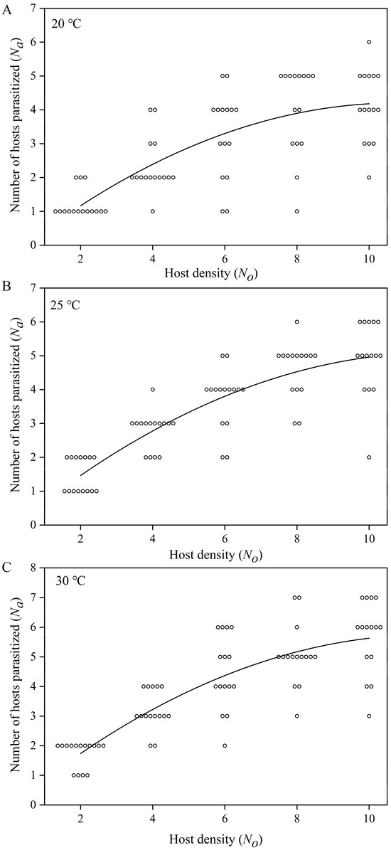 Parasitism of M. alternatus larvae by C. ninghais at three temperatures and five host densities (A–C). Dots represent the number of parasitized hosts at each initial host density, and black lines were predicted using Holling’s disc equation.