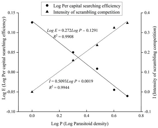 The linear regression analysis of log E and the log intensity of the scrambling competition against log P for C. ninghais parasitizing M. alternatus larvae was conducted in this study. The searching efficiency of C. ninghais decreased with an increase in the parasitoid density, whereas the intensity of the scrambling competition increased (Figure 2). The intensity of scrambling competition (I) formula was used to elucidate the competitive dynamics arising from the increased parasitoid density. Upon fitting to the data, the correlation between the intensity of the scrambling competition (I) and the log of the parasitoid density (P) was found to be (R2 = 0.994, F = 532.73, df = 1, 3, p < 0.001) (Figure 2). This relationship underscores a highly significant correlation between the two variables, signifying a notable elevation in the intensity of the scrambling competition alongside an increase in the parasitoid density. When the parasitoid density reaches five, the calculated intensity of the scrambling competition stands at 0.348.