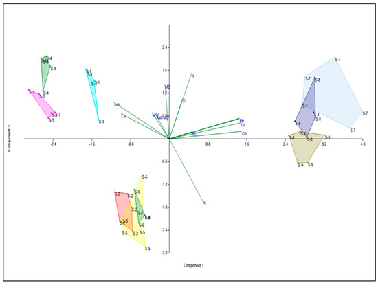 Principal component analysis (PCA) of the pellets produced: medium rotation forestry of poplar (S1); medium rotation forestry of eucalypt (S2); organic hazelnut residues (S3); olive tree pruning residues (S4); forest residues of radiata pine (S5); forest residues of eucalypt (S6); holm oak from urban green areas (S7); eucalypt from urban green areas (S8); Italian stone pine from urban green areas (S9).