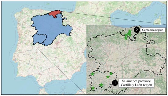 Sampling areas: (1) Salamanca province in Castilla y León region (blue); (2) Cantabria region (red). The dotted line within the Castilla y León region represents the borders of Salamanca province. Sampling sites are marked by stars. Source: Google Satellite and Open Street Map re-elaborated by the authors in QGIS 3.10.14.