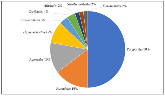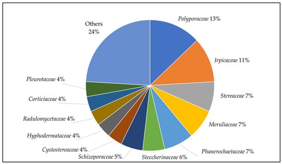 Isolated strains belonging to nine distinct Orders; Polyporales (50%), Russulales (15%), Agaricales (13%) and Hymenochaetales (9%) have the highest proportion (Figure 2). At the family level, collected specimens are much more differentiated and record 25 different families, with Polyporaceae (13%), Irpicaceae (11%), Steraceae (7%), Meruliaceae (7%) and Phanerochaetaceae (7%) having the highest representation; the remaining 49% is made up of families that account for ≤5% of the total specimen amount (Figure 3).