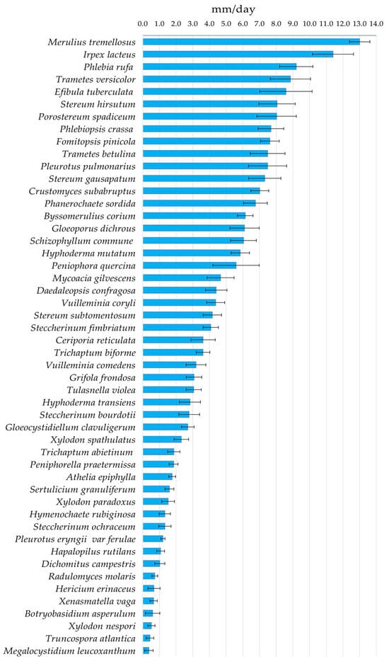 The isolated strains growth rates ranged from 0.4 mm/day to a 13 mm/day. The highest growth rates were reported by: Merulius tremellosus (13 mm/day), Irpex lacteus (11.4 mm/day), Phlebia rufa (9.2 mm/day), Trametes versicolor (8.9 mm/day), Efibula tuberculata (8.6 mm/day), Stereum hirsutum (8.1 mm/day) and Porostereum spadiceum (8 mm/day). On the contrary, the lowest growth rates were reported by: Megalocystidium leucoxanthum (0.4 mm/day), Truncospora atlantica (0.4 mm/day), Xylodon nespori (0.5 mm/day), Botryobasidium asperulum (0.6 mm/day), Xenasmatella vaga (0.7 mm/day), Hericium erinaceus (0.7 mm/day) and Radulomyces molaris (0.7 mm/day).