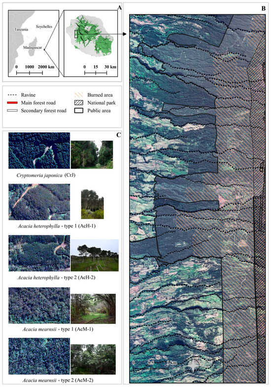 Our study area (Figure 1B) is divided into public and privately owned areas, with protected areas included in the public area. It is covered by three main forest stands—endemic Acacia heterophylla, planted stands of exotic Cryptomeria japonica (managed for timber), and Acacia mearnsii (Figure 1C). Since the 1970s, large parts of these areas have been regularly affected by fires. The most recent fires (2010–2011) severely affected the Acacia heterophylla forest and some stands of Cryptomeria japonica. Reforestation campaigns have been tested on several plots, with varying results. However, the fires have mostly benefited Acacia mearnsii expansion over the entire area due to the pyrophilous properties of this species, despite complex control measures along the forest borders. In this paper, special attention is, therefore, paid to this burned area (mentioned below as the “test area”), where various stands of Acacia mearnsii are present.