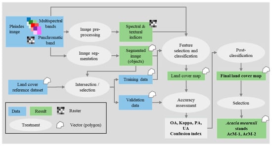 Workflow diagram for mapping forest land cover from the Pleiades image. Final results, in bold, are presented in Section 3.1.