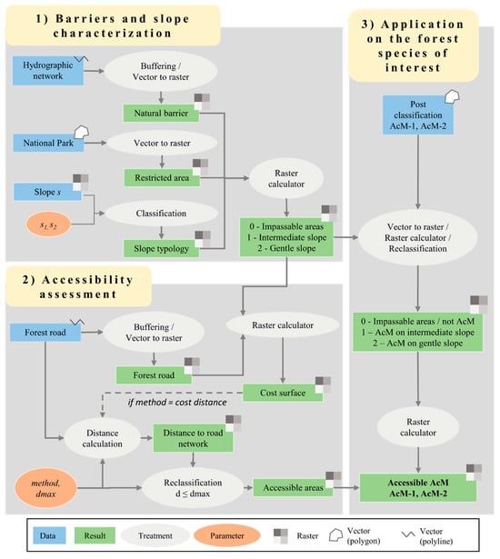 In this section, we describe the methodology developed to assess the accessibility of areas suitable for exploitation, considering topography and distance as the main criteria of our analysis []. Our method is based on a processing chain composed of three modules (Figure 3), which may be replicable with other GIS software or freeware. The first module consists of excluding obstacles (natural barriers, restricted areas, steepest slopes) and classifying the remaining areas according to their slope in order to locate the areas suitable for exploitation. The second module measures the accessibility of these areas, considering their connectivity to the road network. Finally, in the third module, information on the slope and distance to roads is combined with the information on the forest species of interest (in our case, Acacia mearnsii AcM-1 and AcM-2) to map the accessible forest stands.