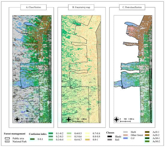 Confusion index (A) and forest land cover maps obtained from the classification (B) and post-classification (C) steps.