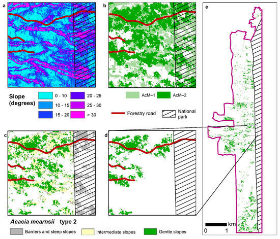Mapping Acacia mearnsii areas suitable for mechanized exploitation. Based on barriers and slope values (a), Acacia mearnsii stands (b) are classified to identify AcM-2 stands on gentle slopes (c), and accessible from forestry roads (d). In the entire test zone (e), Acacia mearnsii suitable for mechanized exploitation represents 15.5% of the original forest surface areas.