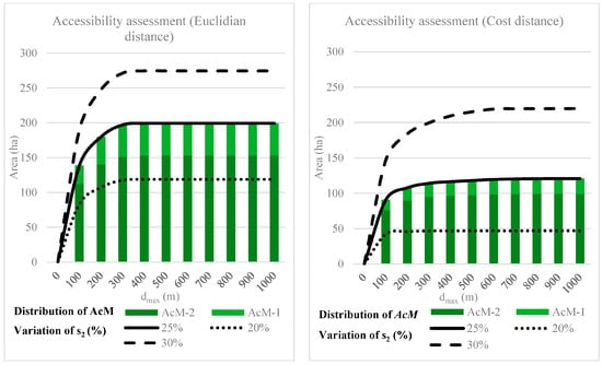 Figure 6 also shows the sensitivity of the accessibility assessment, using either the Euclidian or cost distance approach, to the s2 slope parameter. With the Euclidian approach, all of the AcM-1 and AcM-2 stands are accessible within 400 m of the roads, while there are almost half as many with the cost method. With the latter, the variation of s2 from 20% to 30% changes the accessibility assessment. With s2 = 20%, 39% of the areas suitable for exploitation are located at a cost distance of less than 400 m from the secondary roads. With s2 = 30%, this concerns 76% of the area suitable for exploitation, and the maximum accessible area is 600 m from the secondary roads.