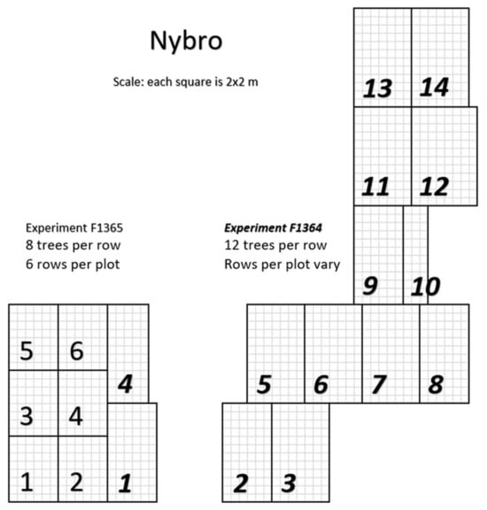 Site layout for Nybro. Each square is scaled to represent planting positions at 2 × 2 m. The numbers indicate a plot within the site.