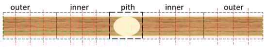 In addition, 15 silver birch and 19 downy birch stems with DBH above 70 mm were randomly sampled, attempting to measure one tree per species and plot where they were present. More downy birch were sampled since there were a larger number present. Cores were taken using a 12 mm diameter increment borer (Haglöf, Långsele, Sweden) as above. These cores were conditioned to room temperature and then sectioned with the pith and bark excluded (Figure 2). At least one thin splinter of wood was split from each sampling position (red dashed lines) by following the grain. These thin wood splinters were placed into glass jars labelled with position (inner/ outer) and tree ID for later maceration.