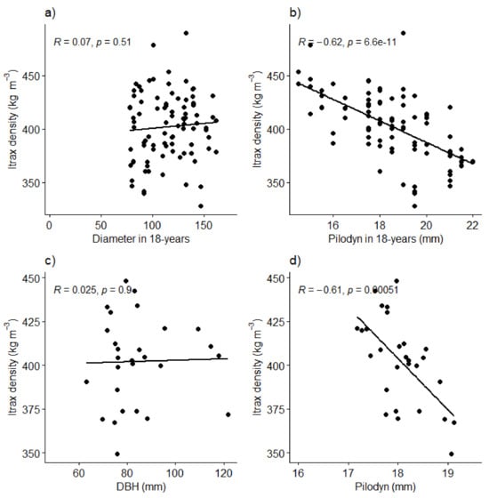 Relationship of individual tree wood density (Itrax density) against diameter at age 15 (a) and Pilodyn penetration depth (b). Relationship of average family wood density and average family diameter (c), and average family Pilodyn penetration depth (d). Solid line is linear relationship between traits, R value is correlation coefficient and p-value a significance for the relationships.