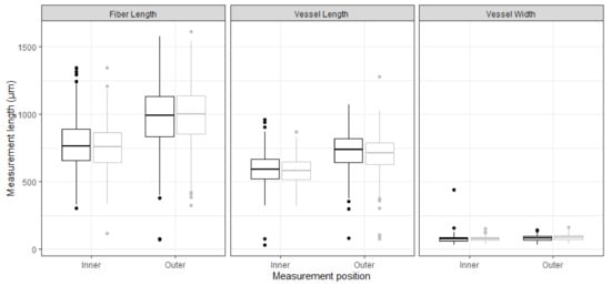 There were significant differences between near the pith and outer measurements (p < 0.05). The differences between species were mostly insignificant (Table 1). Fiber length had similar mean values for downy and silver birch for both inner and outer wood, and the values increased between the two positions (Figure 4). In both species, average vessel length increased slightly in the outer samples. Vessel width for both species had minor changes from inner to outer sampling position. For each species, the differences between inner and outer measurements were significant based on the results from paired t-tests, yet the difference between species by position was inconsistently significant and the ranges of values overlap (Figure 4).