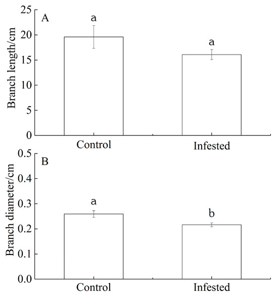Differences in (A) branch length and (B) branch diameter of Prunus armeniaca infested with Sphaerolecanium prunastri (infested) and in the uninfested controls. Data: mean ± SE. Different lowercase letters indicate a significant difference (Independent two-sample t-test; p < 0.01).