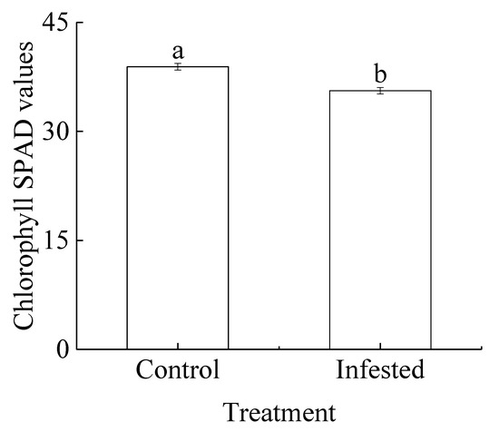 The mean chlorophyll SPAD value for the GS-infested wild apricot trees was 8.49% lower than that of the control trees, and the difference was significant (p < 0.01; Figure 2).