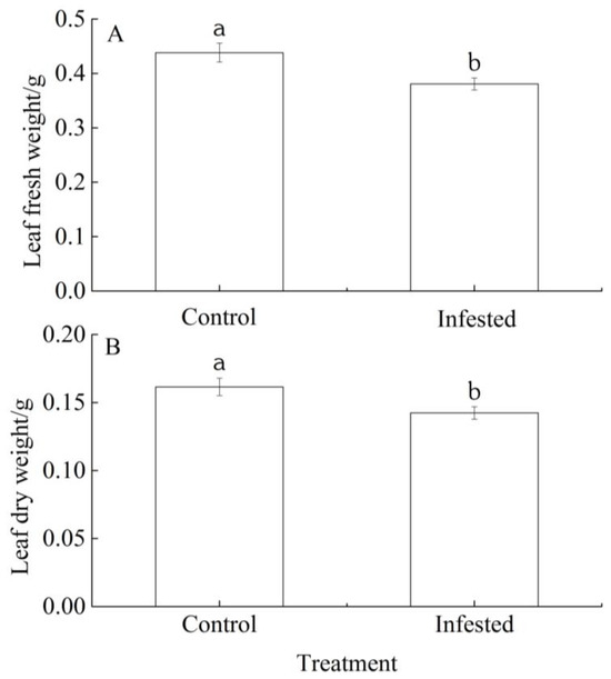 Differences in (A) leaf fresh weight and (B) leaf dry weight of Prunus armeniaca infested with Sphaerolecanium prunastri and the uninfested controls. Data: mean ± SE. Different lowercase letters indicate a significant difference (Independent two-sample t-test; p < 0.01).