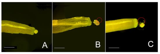 Our previous research on the pollen vitality of A. mangium has proven the vitality of fresh pollen []. Less than 6.67% of polyad–pistil combinations resulted in the germination of the grains after self-pollination or hand-controlled cross-pollination (Table S1), and others (over 90% of the pollen grains) produced no pollen tube growth on the stigma/style (Table S1, Figure 1A). Polyad–pistil combinations resulted in the germination of a minority of the grains at different times, as shown in Figure S1. Only 2.78% of pollen grains had grown pollen tubes at 9 h after self-pollination, and 3.13% of pollen grains had grown pollen tubes at 9 h after cross-pollination (Table S1). Moreover, all of the germinated pollen tubes were twisted towards the stigma and could not enter the style channel (Figure 1B,C). Therefore, we speculate that the self-pollination and cross-pollination of A. mangium are incompatible, considering our previous research []. Furthermore, GSI mediated by Ca2+ may explain why pollen grains cannot grow pollen tubes after self-pollination [].
