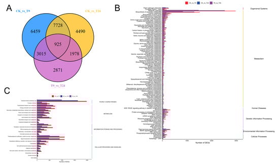 Functional annotation results of the differentially expressed genes between comparison of CK/T0 vs. T24, T9 vs. T24 and CK/T0 vs. T24 using the transcriptome data from A. mangium; (A) Venn diagram showing the shared and common DEGs under all treatments, (B) annotation information obtained from the Kyoto Encyclopedia of Genes and Genomes (KEGG), (C) functional annotation of the DEGs based on the Eukaryotic Orthologous Groups (KOG) database.