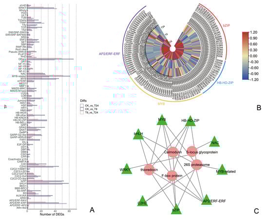 Distribution of the differentially expressed transcription factors (TFs) and co-expression networks between candidate genes and TFs. (A) Quantitative statistics for the differentially expressed TFs; (B) Heatmap showing the candidate TFs under various self-pollination conditions; (C) Co-expression networks between DEGs related to SI and TFs under different self-pollination times.