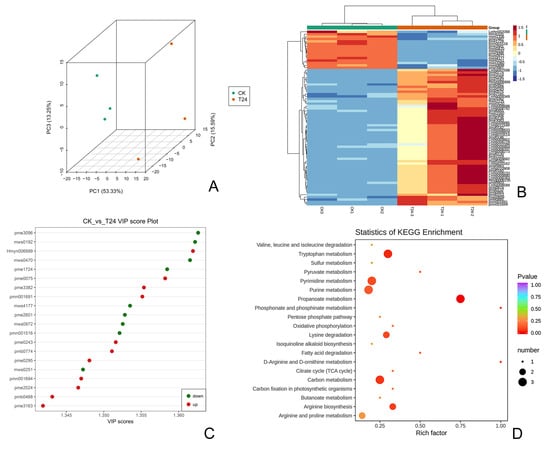 Metabolome profiling of A. mangium flowers under different self-pollination times. (A) Principal component analysis (PCA) scores for the first component (PC1), second component (PC2), and third component (PC3). Within the same area, the farther from the origin, the closer the distance, and the higher the correlation. (B) The results for differentially expressed metabolites in the OPLS-DA model with the top ranked VIP value. (C) Hierarchical clustering analysis of the metabolites. (D) KEGG classification and enrichment diagram of differential metabolites.