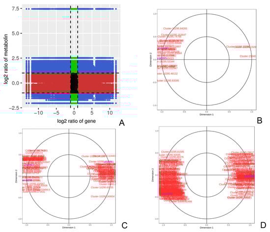 Analysis of differentially expressed genes and metabolites. (A) The nine-quadrant chart shows the different multiples of gene and metabolites. It is divided into quadrants 1–9 from left to right and from top to bottom with black dashed lines. Genes and metabolites with negative correlations are presented, in quadrants 6, 8 and 9, genes are upregulated, and metabolites are unchanged or downregulated. (B–D) CCA diagram of differentially expressed genes and metabolites.