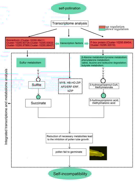 The six identified pathways, sulfur metabolism, butyric acid metabolism, tyrosine metabolism, phenylalanine metabolism, alanine metabolism, and valine, leucine, and isoleucine degradation, were correlated with the SI-related genes, and all metabolites were found to be directly or indirectly associated with the SI genes. Meanwhile, the citric acid cycle (or tricarboxylic acid cycle, or TCA) was also found to be an important pathway for connecting SI genes and metabolites (Figure 6). The phenylalanine metabolism of A. mangium corresponds to previous research showing that phenylalanine related to RNase NE inhibits the elongation of germ tubes via degradation of microbial RNAs []. Amino acids/peptides and tricarboxylic acid cycle-related metabolites were also found to be involved in heteromorphic self-incompatibility []. Additionally, the compounds that were correlated with these genes in the six pathways, namely, succinate, methylmalonate, and 3-hydroxypropionate, were considerably enriched, with succinate accounting for the highest proportion. Thioredoxin h2 and the mitochondrial thioredoxin system regulate the metabolic fluxes throughout the tricarboxylic acid cycle and associated pathways (glycolysis, gluconeogenesis and the synthesis of glutamine) []. The F-box targets citrate synthase 2 for proteasomal degradation, thereby suppressing the glyoxylate cycle, an anabolic pathway that replenishes the TCA cycle with succinate for the activation of gluconeogenesis []. Notably, in our results, the significantly upregulated and SI-related transcripts (F-box and thioredoxin gene families) were associated with the metabolites (succinate, methylmalonate and 3-hydroxypropionate) in the corresponding pathway, and were all significantly downregulated. Other research has found that metabolites are associated with the expression of transcripts, which are related to plant SI [,,]. Therefore, we speculate that these metabolites, genes, and SI-related TFs are associated with the inhibition of pollen growth and the occurrence of SI in A. mangium (Figure 7).