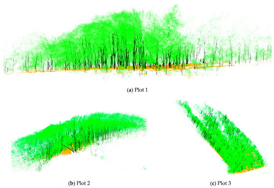 Figure 17c), which leads to a decrease in the effectiveness of normal vector-based features. The possible reasons lie in that the trees start branching from a height that is close to the ground, and the terrain slope close to 42° also affects the growth direction in plot 3, which is similar to the conclusion in [