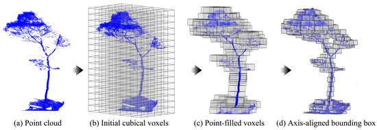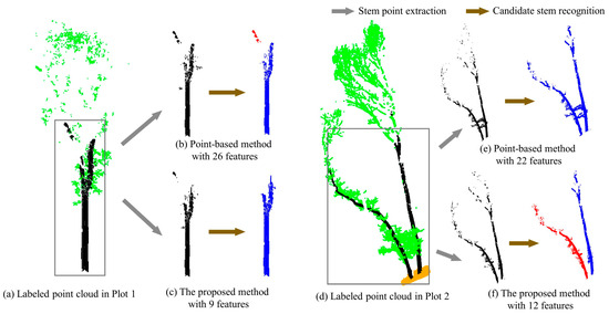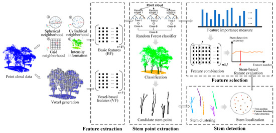 25] adopted two-scale classification based on the dimensionality features to extract the candidate stem points. Additionally, the point cloud is translated into a voxel structure and the flatness saliency feature is calculated to recognize the stem points [