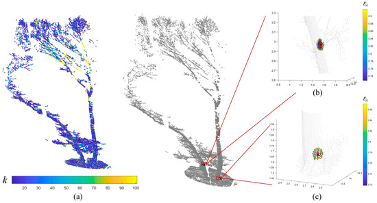 21] proposed a method to extract stem points using the curvature feature of the points and connected component segmentation. A part of the branches and foliage points were removed by using the difference of the surface curvature, and subsequently, the stem points were identified effectively via connected component segmentation. Moreover, the deviation between the z-component of normal vectors is commonly used in the first step of stem and leaf separation because it represents the spatial distribution relative to the vertical direction (i.e., verticality) [
