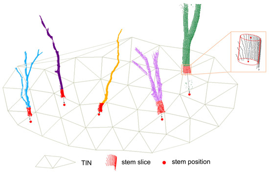 12]) is applied to the sliced points. The point clouds that are successfully fitted to the model will be considered as stem points. However, those methods are easily disturbed by a high stem density and rich understory vegetation, leading to model fitting failure. Therefore, the height and thickness of slices play crucial roles in model-fitting methods [