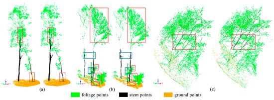 But as point-level accuracy is also validated in this study, point-level reference data are also required. Below is the process of manually labeling each point in this study. We manually divided all the points into three classes: foliage, stem, and ground. Initially, the ground points were extracted via CSF filtering, and the misclassified points were then refined through manual inspection. Subsequently, we separated the stem points from the remaining points, with only the trunk, primary, and secondary branches labeled as stem points in this study, as shown in