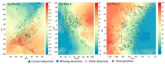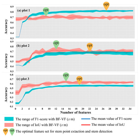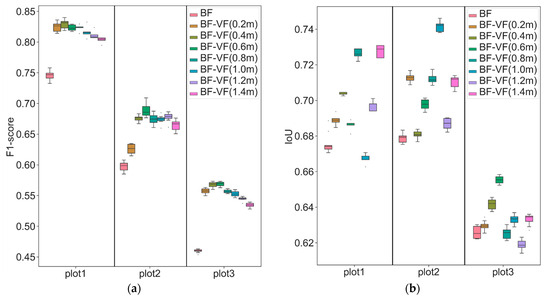 Figure 10a). However, for stem detection, the optimal results were achieved in three different plots with voxel sizes of 1.4 m, 0.8 m, and 0.6 m (