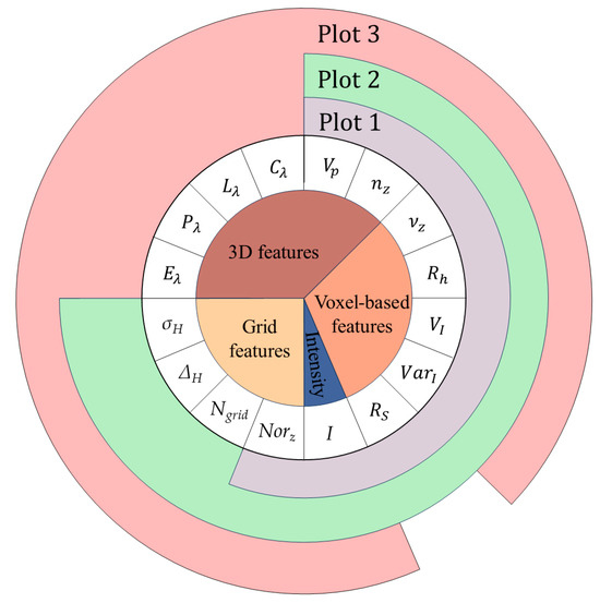 Norz related to height are included in the optimal feature set and make significant contributions to all three plots. This is because the ground, stem, and foliage have different materials and spatial distributions. Moreover, the normal vector related with point distribution in the vertical direction was often used in previous studies [